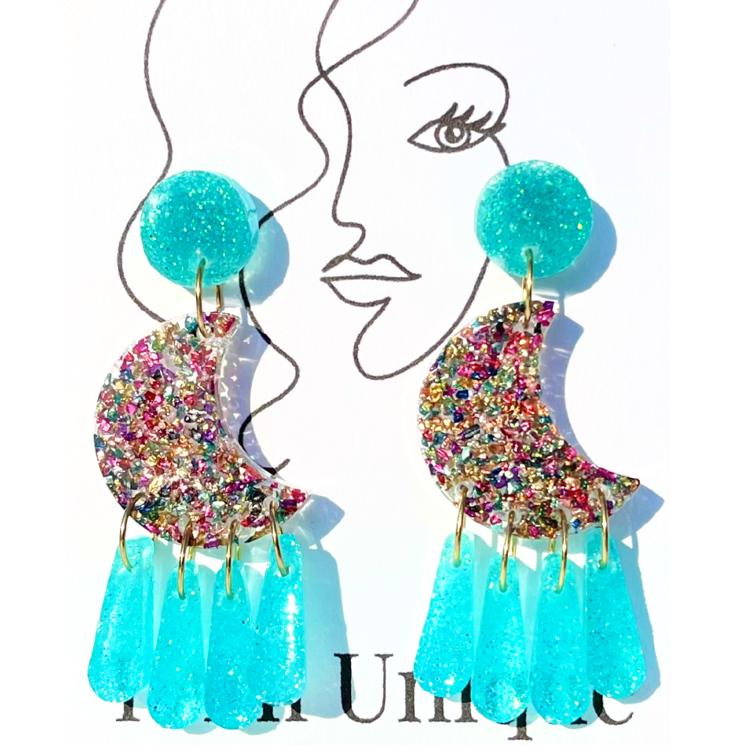 These earrings are a dose of celestial glam featuring aqua-colored resin drops and a crescent moon full of glitter that catches the light just right